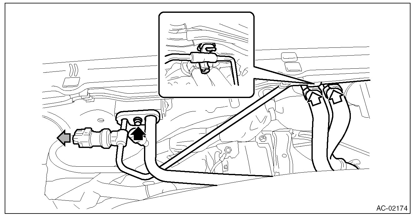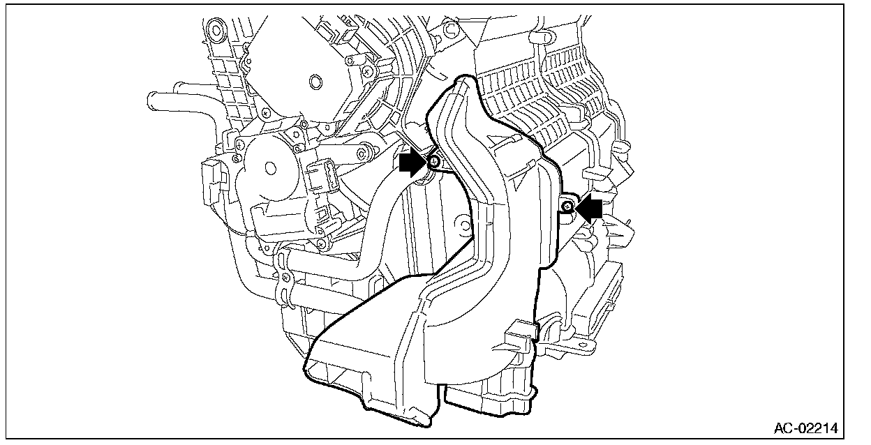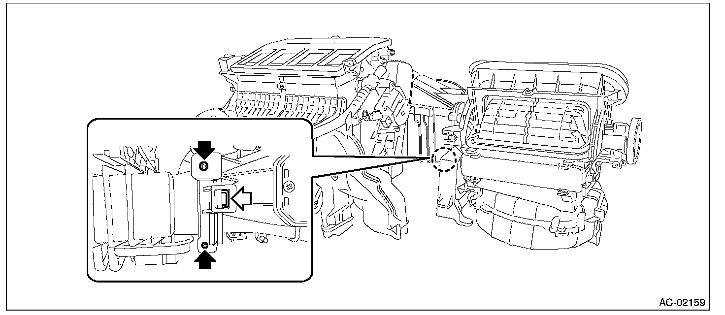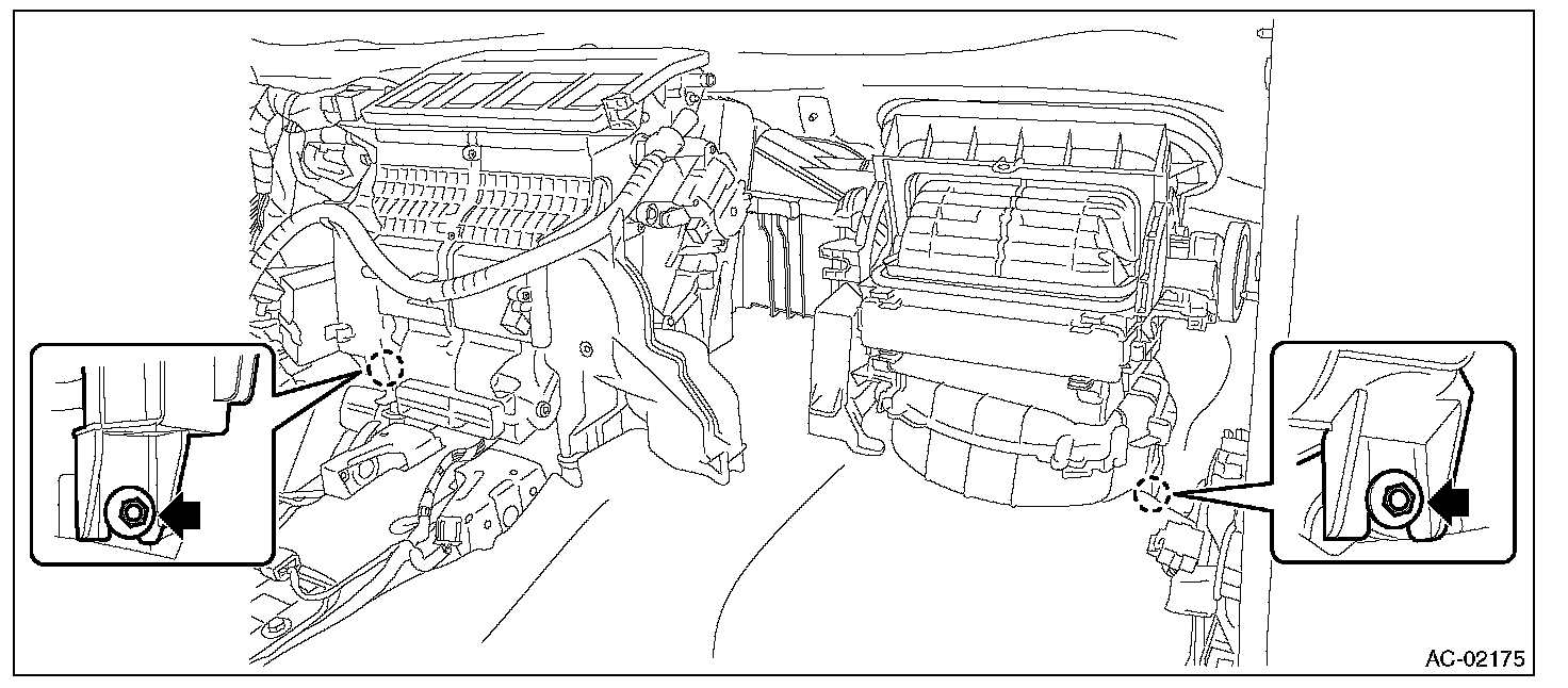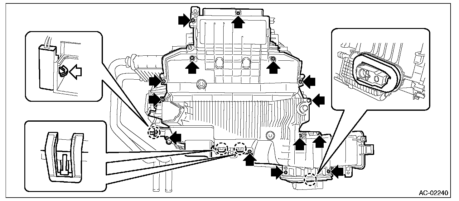 4. Remove the connector and bolts, and remove the expansion valve and AC pipes from the evaporator.
