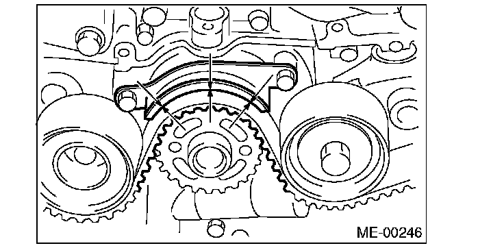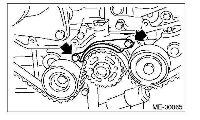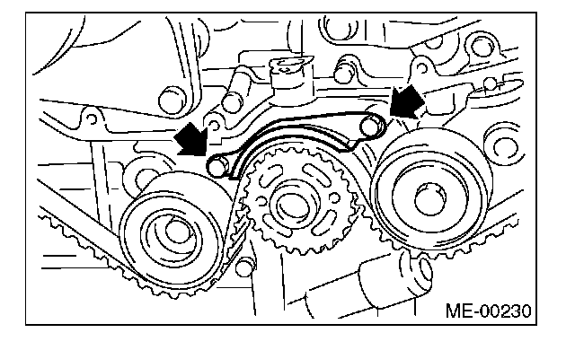 (2) Using white paint, put an alignment mark or an arrow mark on timing belts in relation to the crank sprocket and cam sprockets.