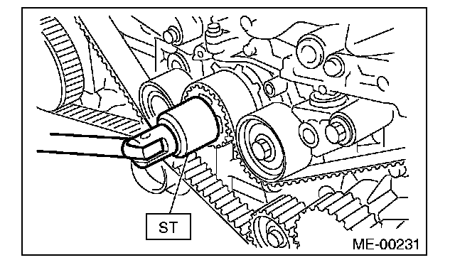 2) Check the belt tension pulley for smooth rotation. Replace the automatic belt tension adjuster assembly with a new part if abnormal noise or excessive play occurs.