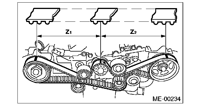 1) Check the timing belt teeth for breaks, cracks or wear. If any fault is found, replace the timing belt.