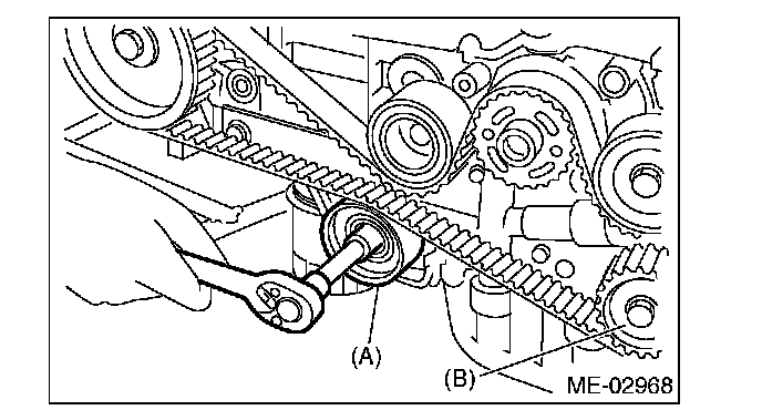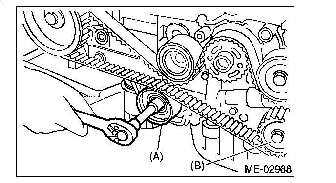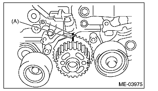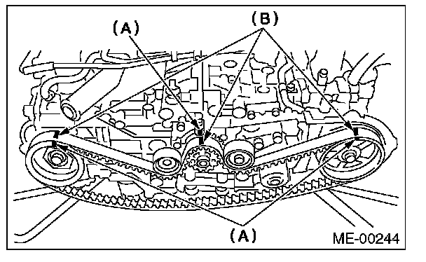 4) While aligning the alignment mark (B) on timing belt with the mark (A) on sprockets, position the timing belt properly.