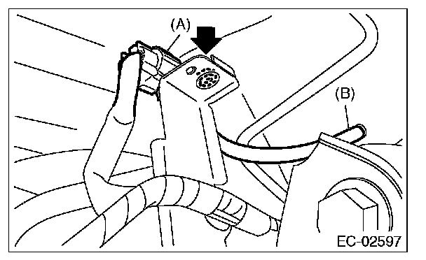 5. Pull out the vacuum hose (B) from vehicle.