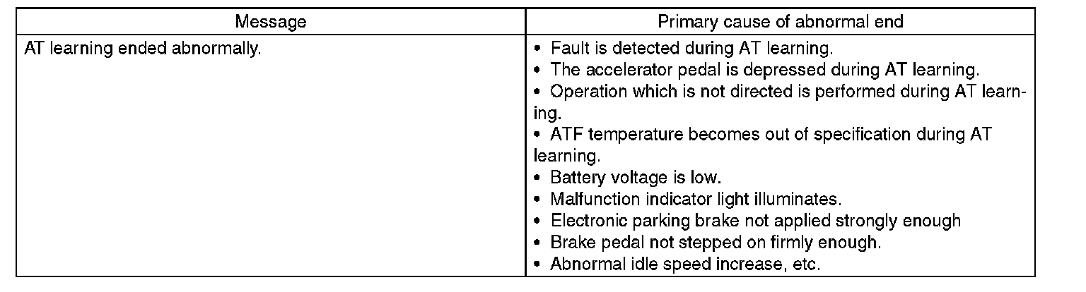 During AT learning in progress, AT OIL TEMP light in the combination meter starts flashing at 2 Hz and the learning operation starts. The following message is displayed on the screen when the AT OIL TEMP light which was flashing at 2 Hz turns off.