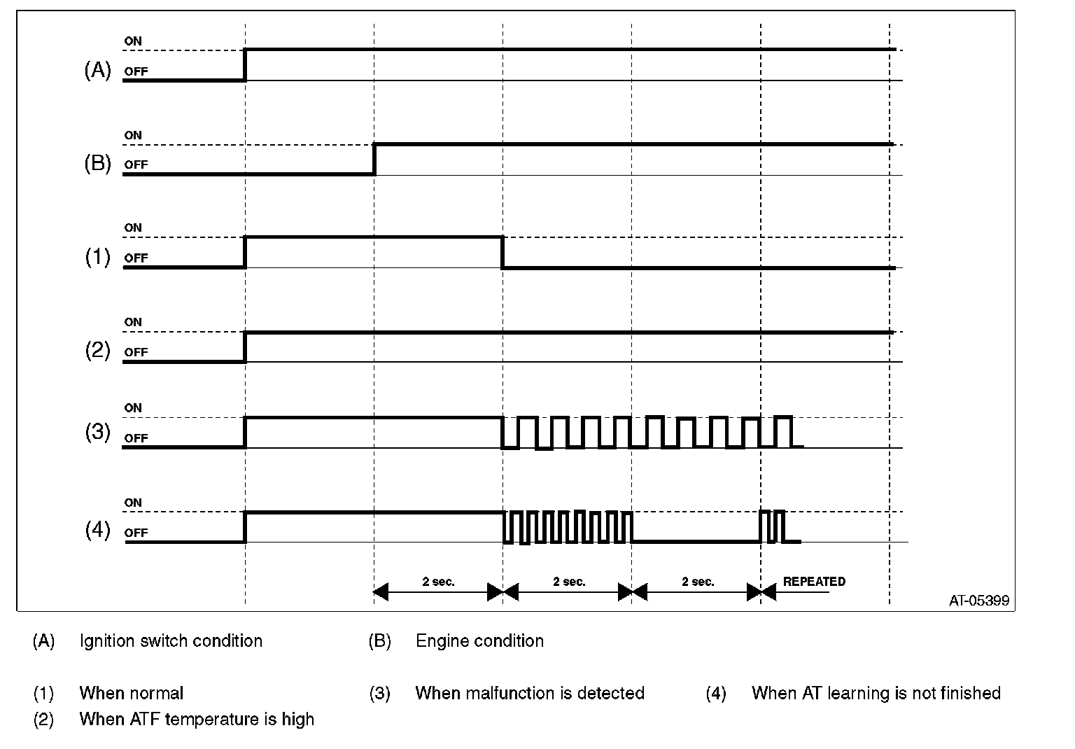 ^ When AT learning is not finished AT OIL TEMP light repeats "Blinking at 4 Hz -> Turning OFF" every two seconds, when the AT learning is not finished with engine ON. In this case, perform the "Learning". (During AT learning, the light blinks at 2 Hz or illuminates.)