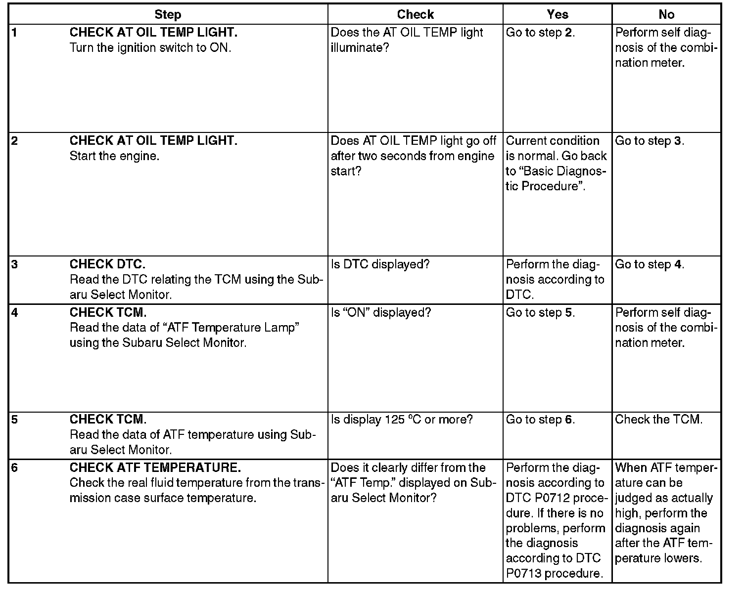 1) Warm up or cool down until the ATF temperature displayed on the Subaru Select Monitor is 40 - 65°C (104 - 149°F).