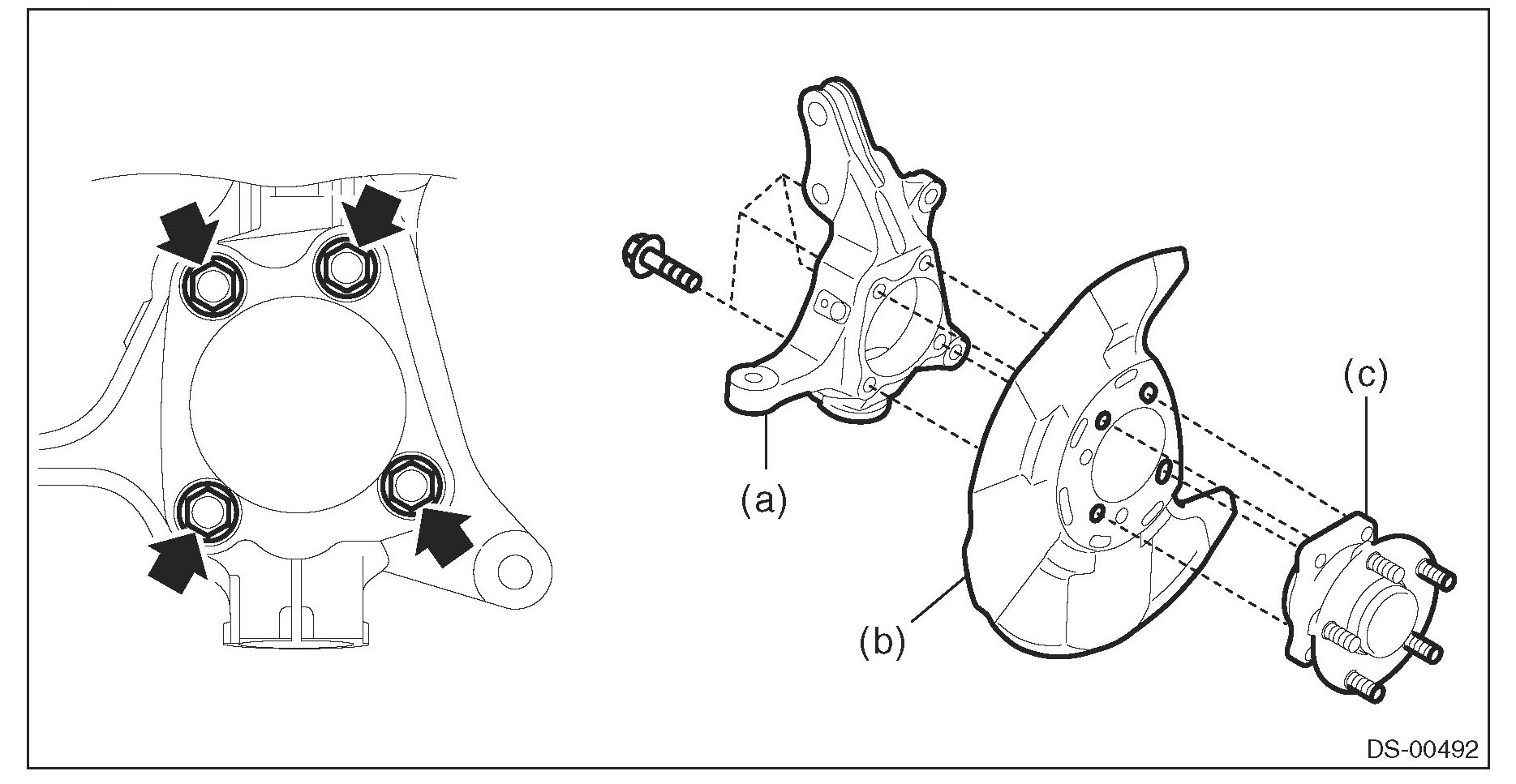 2) Install the front axle housing (a) and front hub unit bearing (c) to the disc brake cover (b) as shown in the figure, and tighten the bolt.