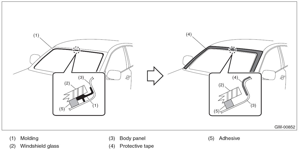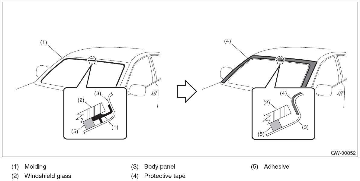 5. Remove the molding from the glass and tape the body side of the circumference of windshield glass for protection.