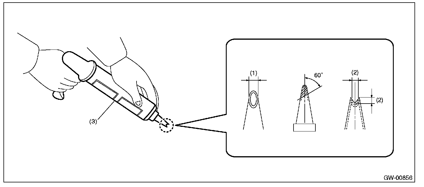 1. Cut the cartridge nozzle tip as shown in the figure, and set the adhesive in the sealant gun.