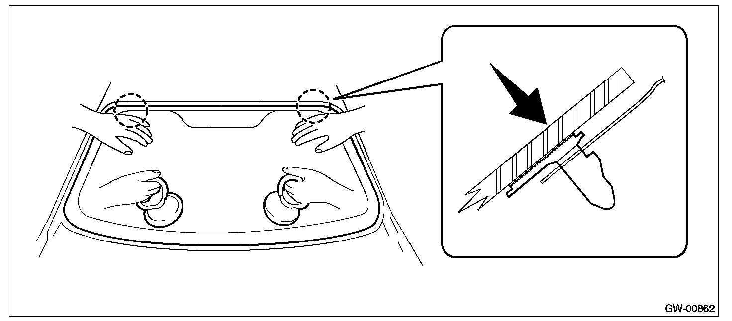 3. Using suction rubber cups, fit the locator pins into the body side, and attach the windshield glass.