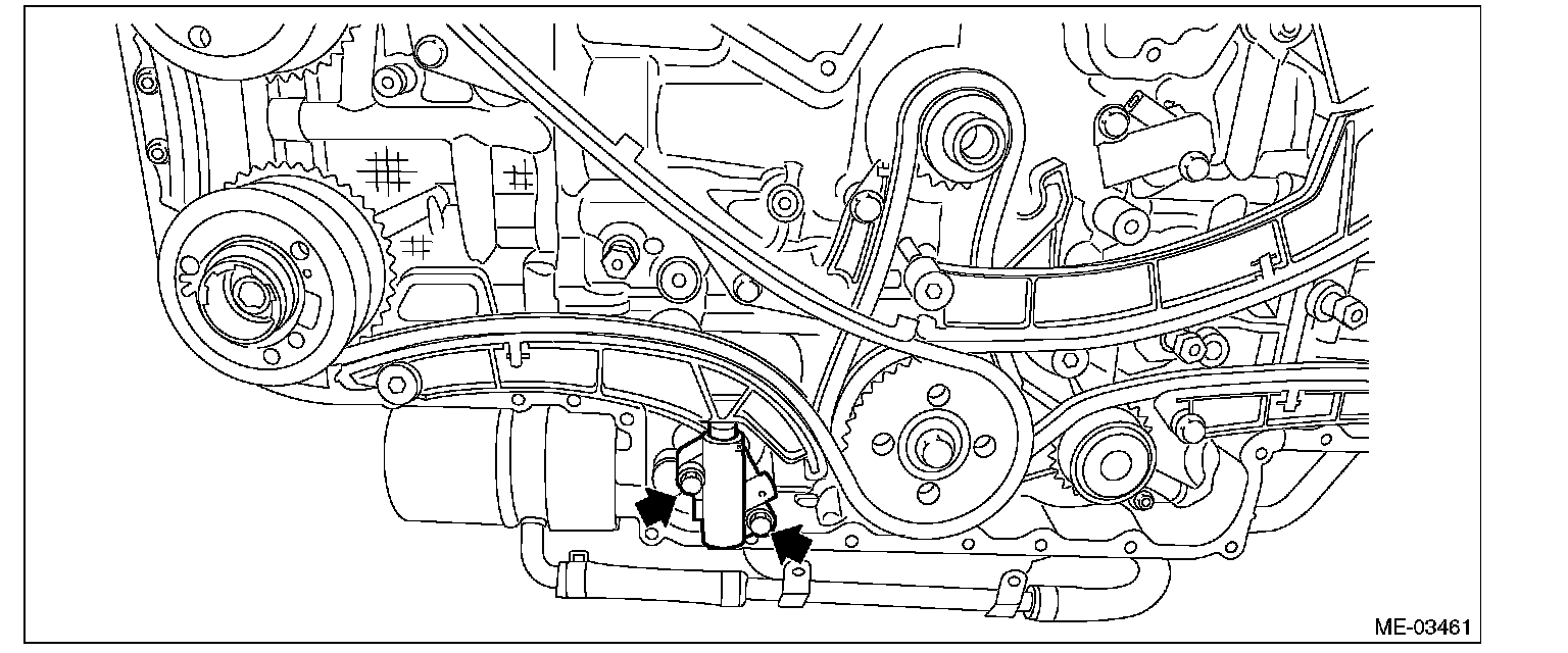 When removing chain tensioner (main), hold the plunger by hand so that it does not come flying out.