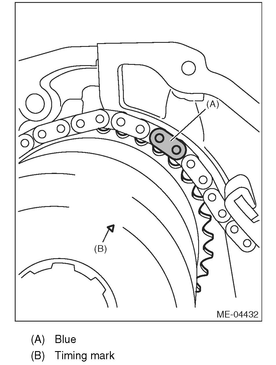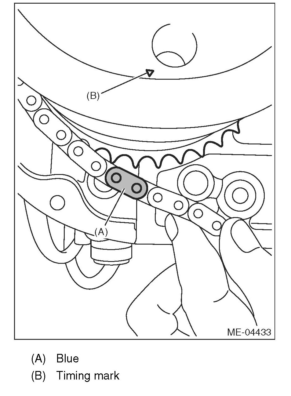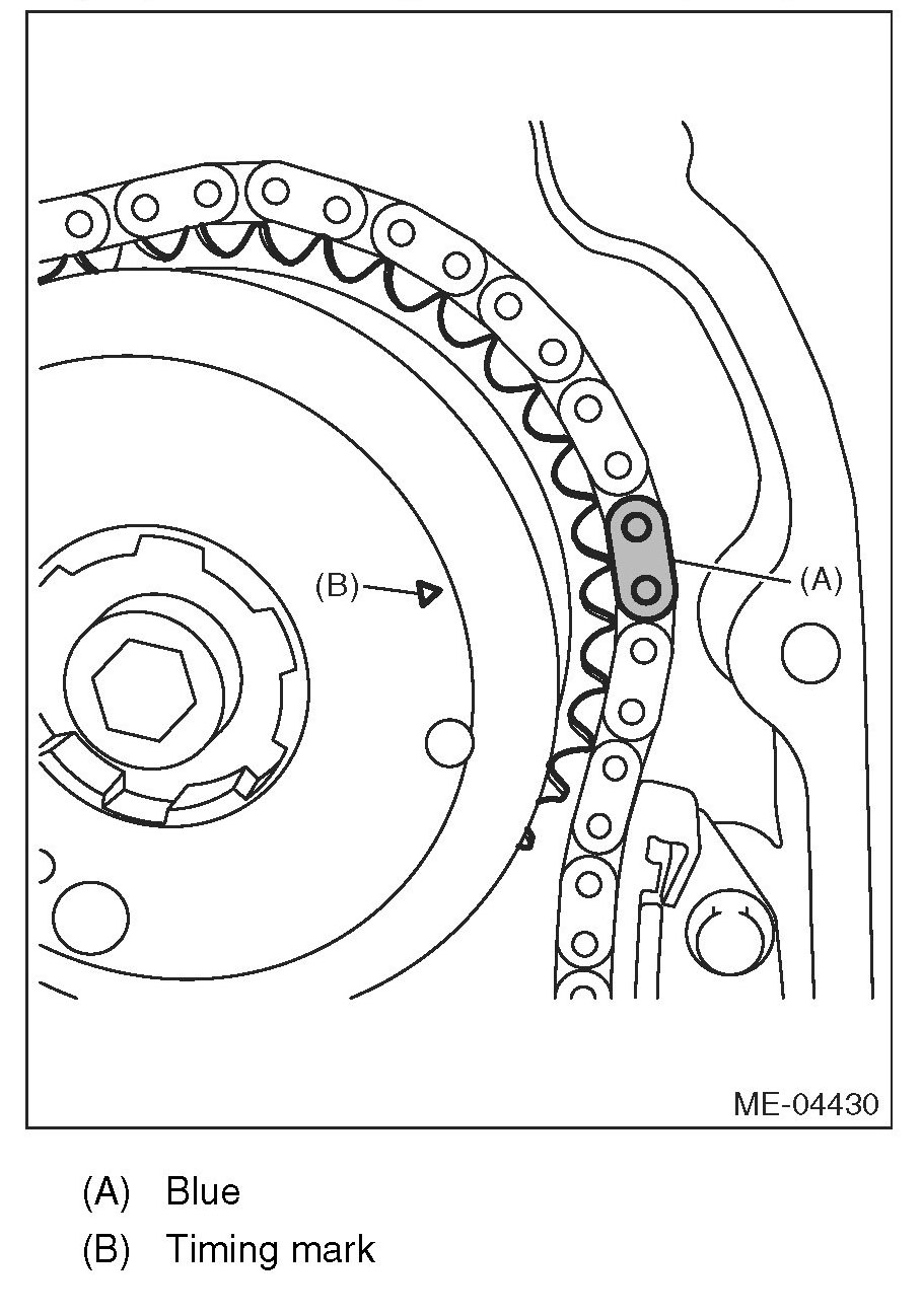 (3) Make sure that the LH side cam sprocket timing mark is aligned to the timing chain mark (blue).