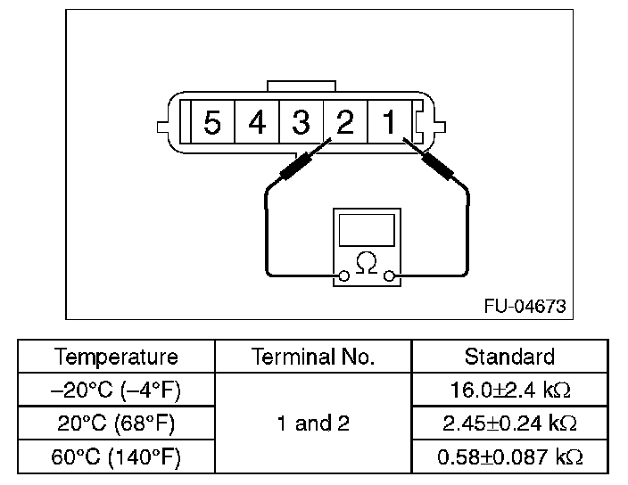 1. Connect battery positive terminal to terminal No. 3 and battery ground terminal to terminal No. 4, circuit tester positive terminal to terminal No. 5 and the circuit tester negative terminal to terminal No. 4.