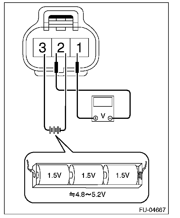 2. Connect dry-cell battery positive terminal to terminal No. 3 and dry-cell battery ground terminal to terminal No. 2, circuit tester ground terminal to terminal No. 2 and the circuit tester positive terminal to terminal No. 1.