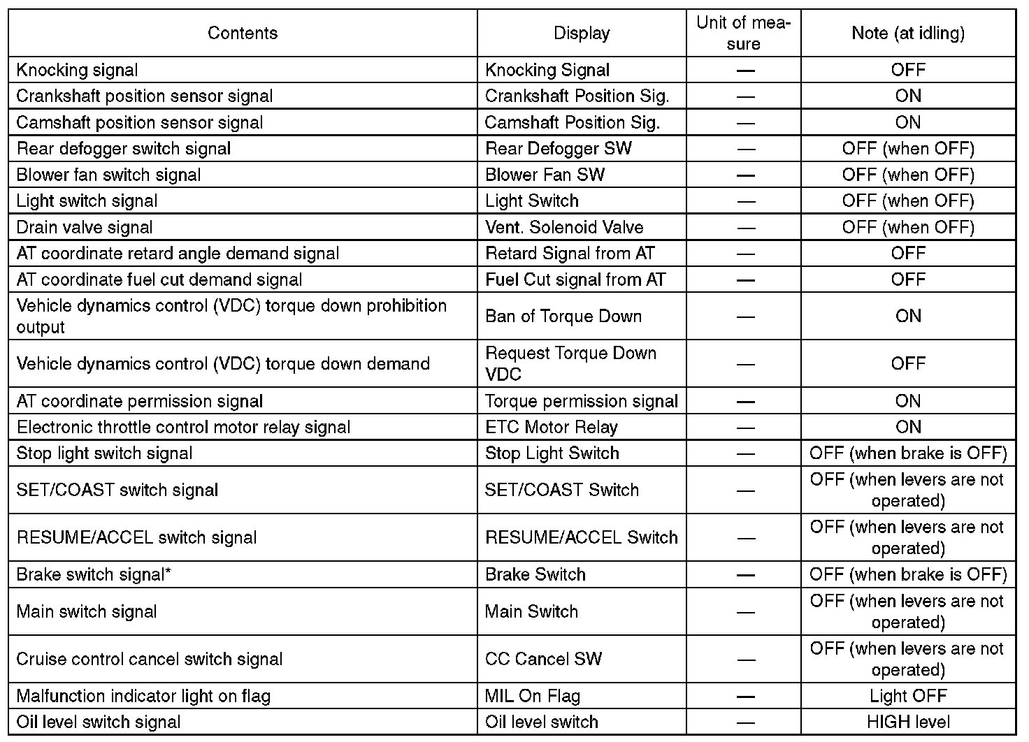 - *: For models without cruise control, the brake switch signal does not change.