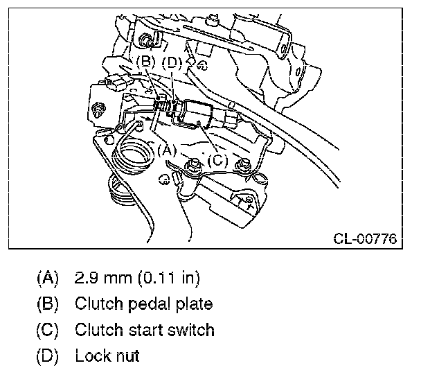 2) Install so that gap (A) of the clutch pedal plate and clutch start switch is 2.9 mm (0.11 in), and tighten the lock nut.