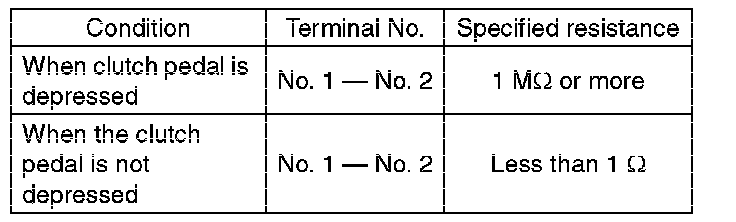 (2) Measure the resistance between terminal 1 and 2 of the switch. If the resistance is not within the specification, check the clutch stroke and installation condition, and check the clutch switch again.