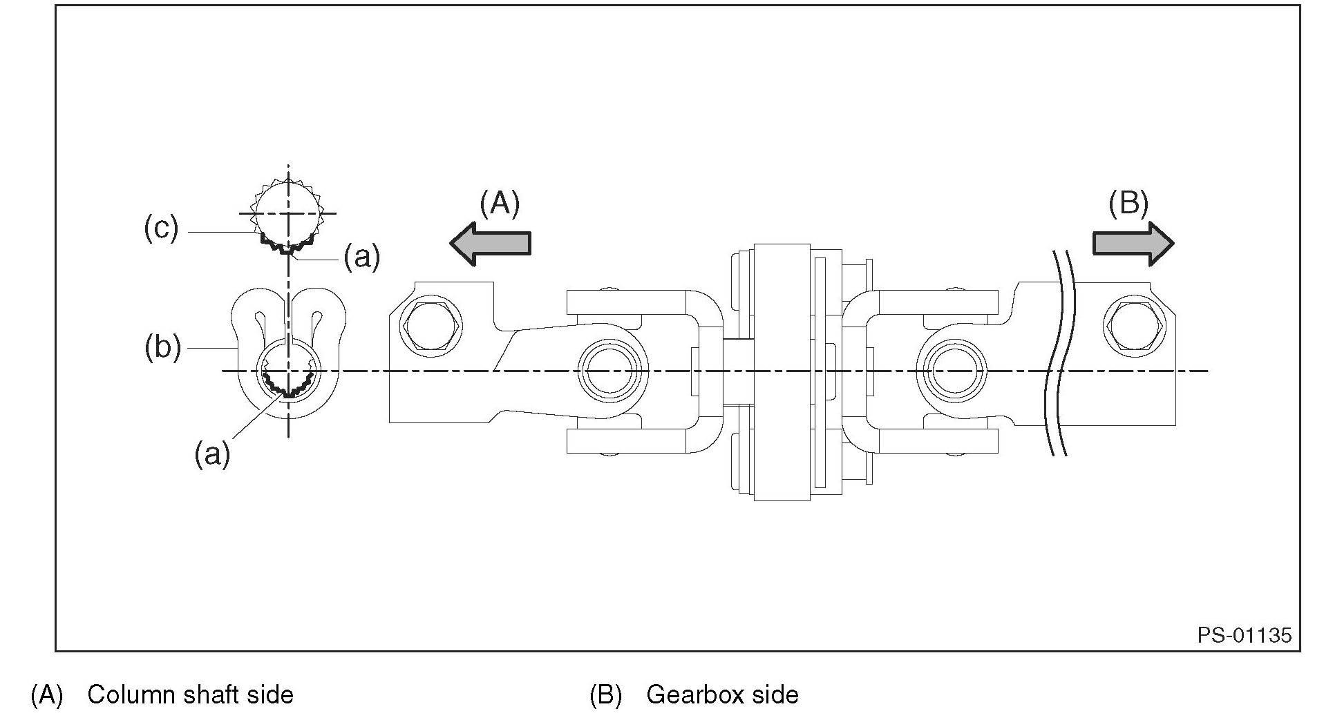 3) Align the cutout portion (a) at serrated section of the column shaft (c) and yoke (b), then install the universal joint into column shaft.
