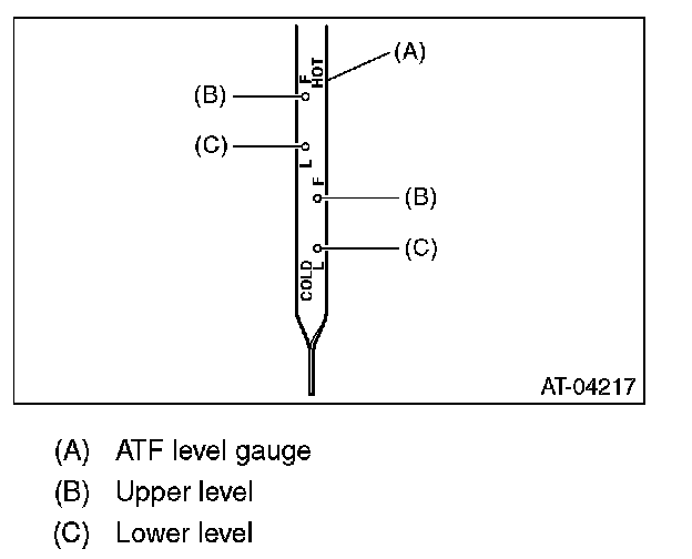 6) Remove the oil level gauge again and make sure that the ATF level is between upper and lower marks of the HOT side.