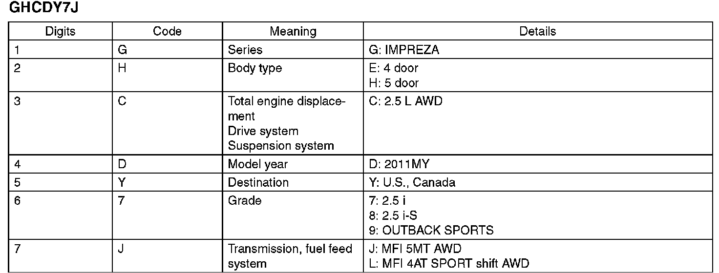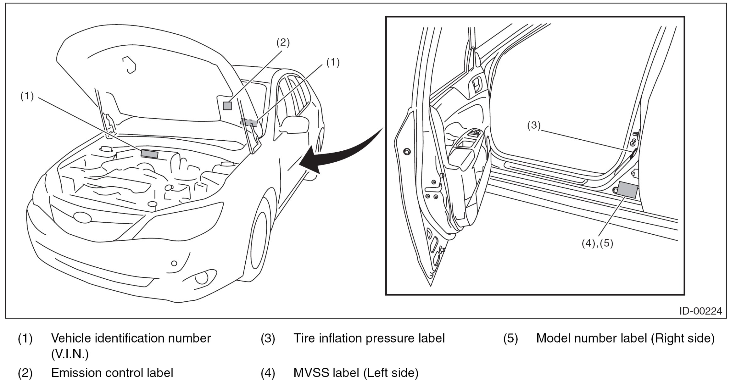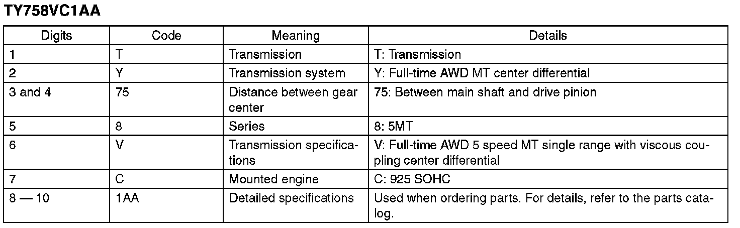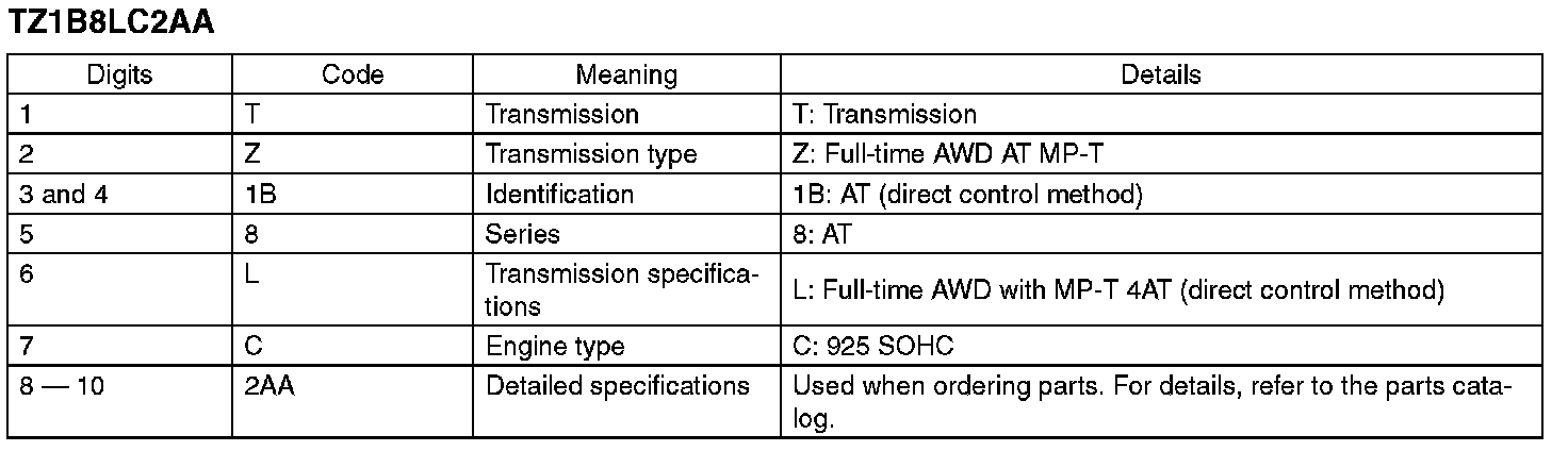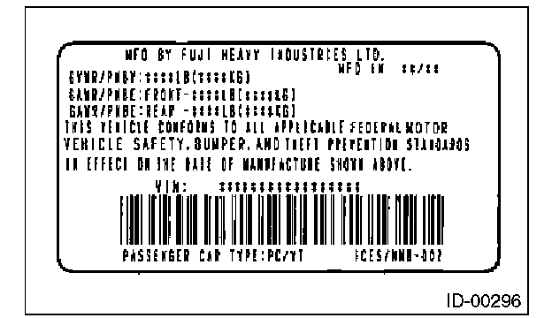The model number label indicates: the applied model, the option code, the trim code, the engine type, the transmission type, and the exterior color code. This information is helpful when placing orders for parts.