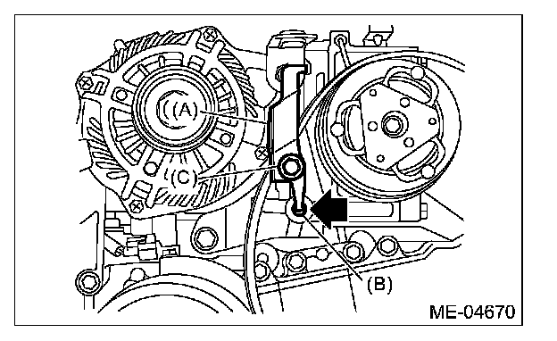 5) As shown in the figure, insert the claw of the belt stopper (A) to the lower hole (B) of the compressor bracket, then attach with bolt (C).