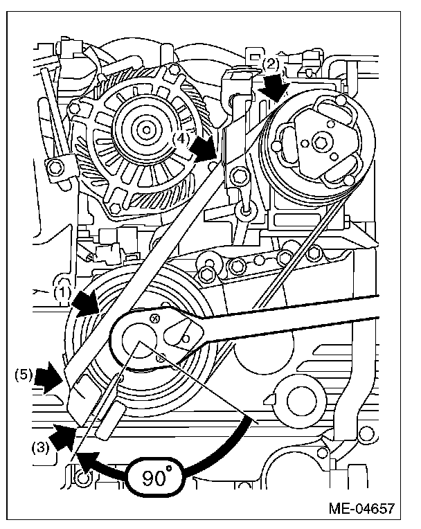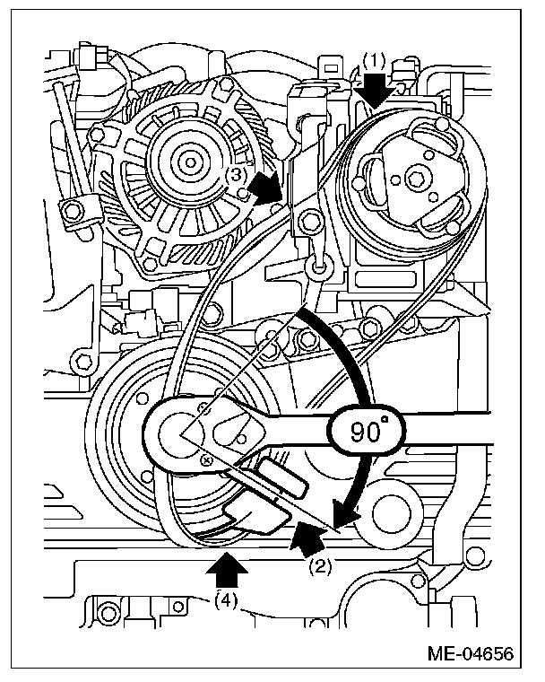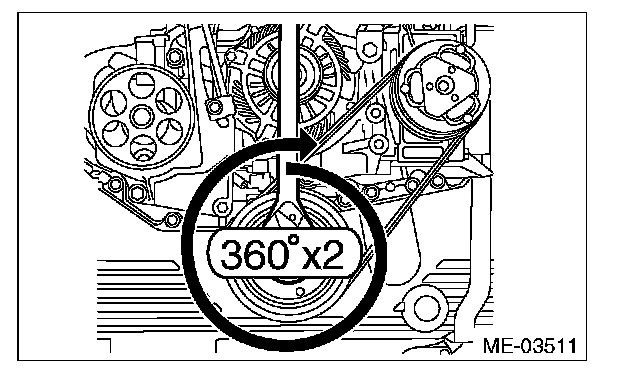 16) Make sure that the belt rib is securely installed on the groove of each pulley, then turn the crank pulley slowly, twice in the clockwise direction, to seat the rear side belt properly.