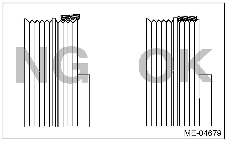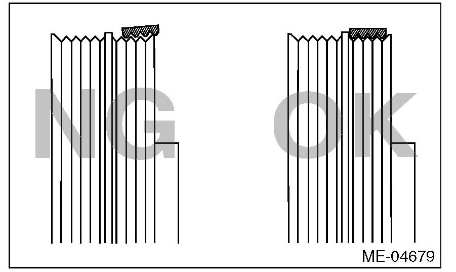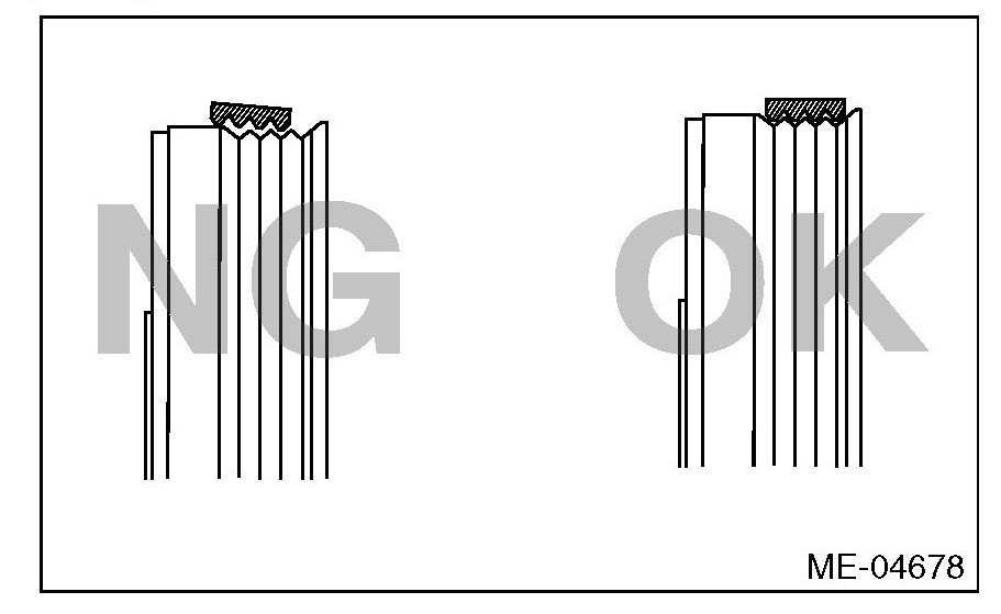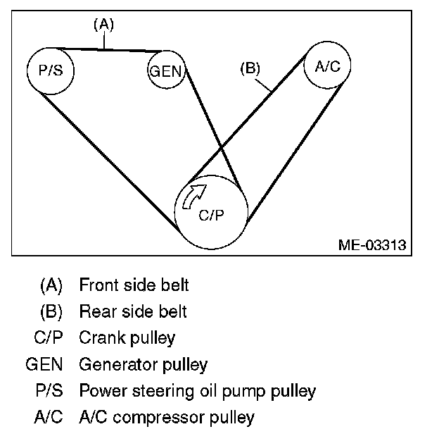 ^ If the front side belt tension is lower, the front side belt and crank pulley slip, causing abnormally high temperature on the crank pulley due to frictional heat. If this condition repeatedly occurs, the front side belt may abnormally wear, causing abnormal noise, front side belt damage or crank pulley damage.