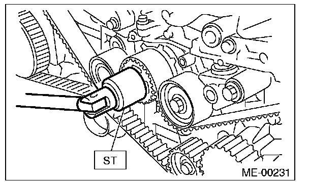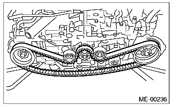 2) Check the condition on the back surface of the timing belt. If cracks are found, replace the timing belt.