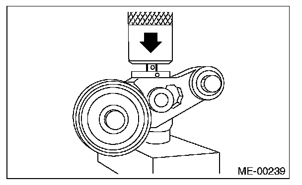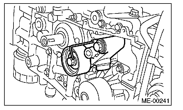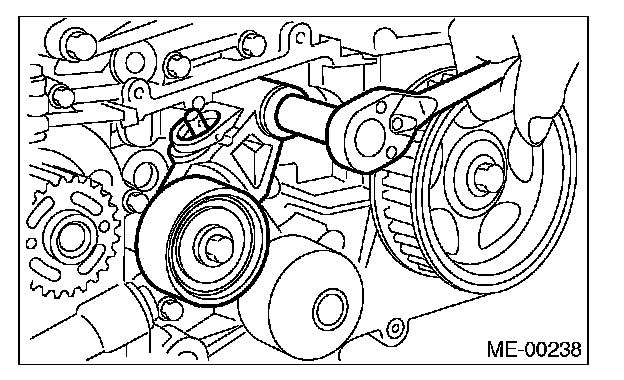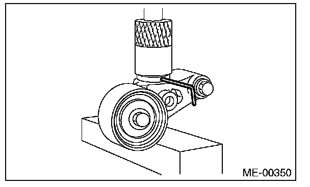 2) Check the belt tension pulley for smooth rotation. Replace the automatic belt tension adjuster assembly with a new part if abnormal noise or excessive play occurs.