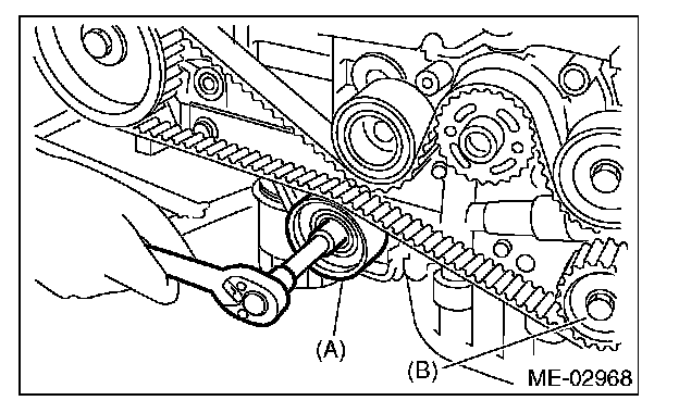 4) While aligning the alignment mark (B) on timing belt with the mark (A) on sprockets, position the timing belt properly.