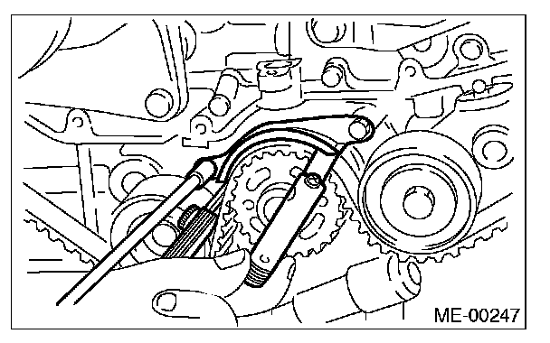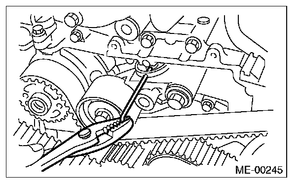 7) After ensuring the marks on timing belt and camshaft sprockets are aligned, remove the stopper pin from belt tension adjuster.