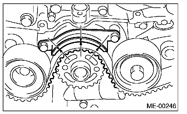 (2) Using white paint, put an alignment mark or an arrow mark on timing belts in relation to the crank sprocket and cam sprockets.