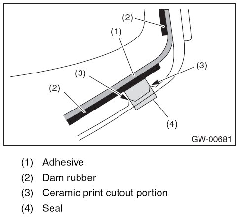 - Attach the seal between the ceramic print cutout portions (3) located at the lower edge of the glass (driver's seat side).