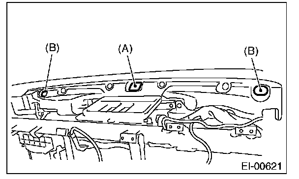 1. Insert the matching pins (three places) on the instrument panel tip into the grommet (A) and (B) on the body panel side.
