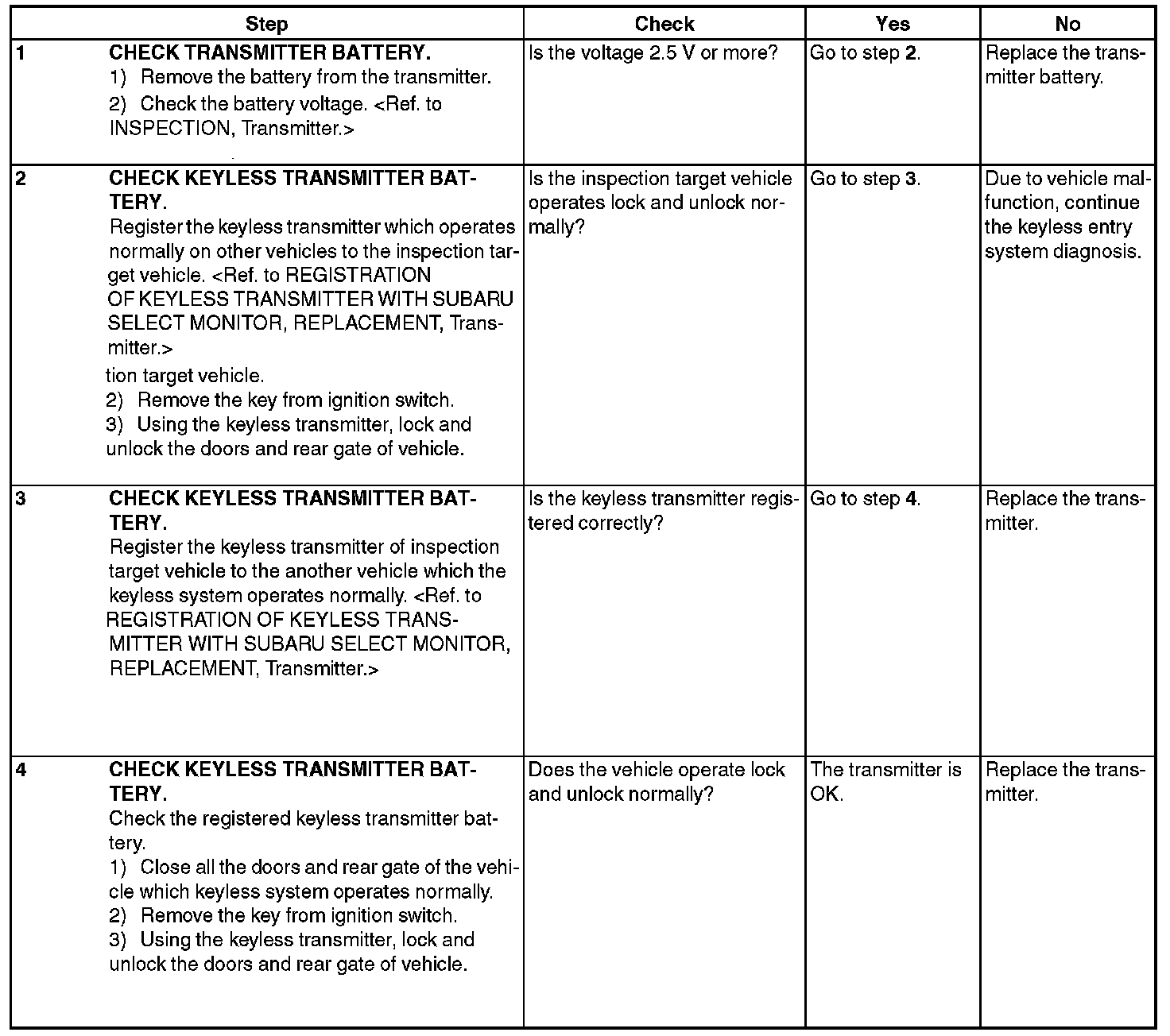 CAUTION: Be sure to reset the keyless transmitter of other vehicle which is registered to the inspection target vehicle, and the vehicle to which the keyless transmitter is registered for inspection, to the condition before performing the inspection. (Register the keyless transmitter again.)