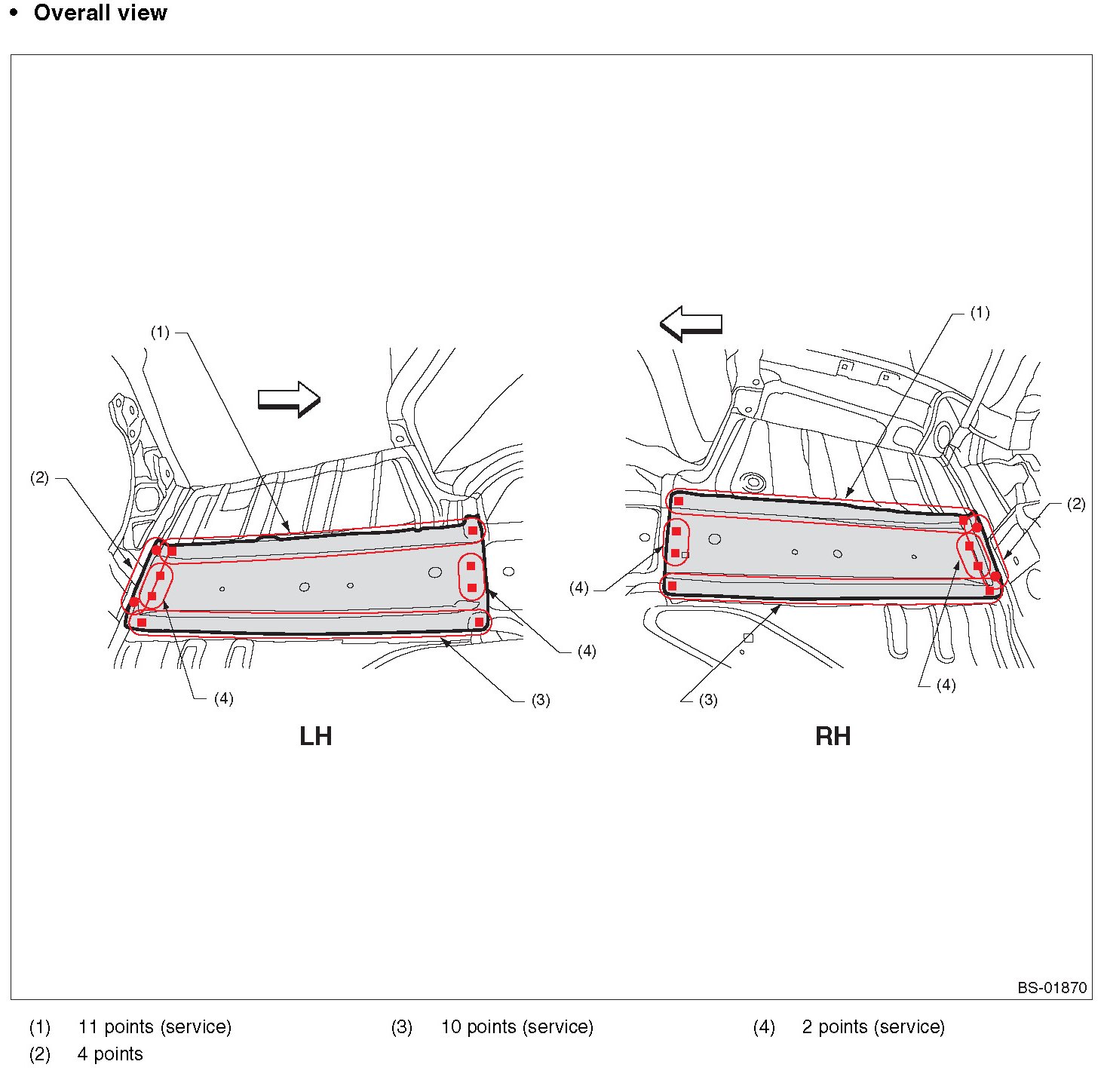 - Symbols and number of points indicate the welding method and the number of welding points. Text in brackets indicate the direction of removal for welded parts, and numbers indicate the number of panels to be drilled to remove welded sections of panels.