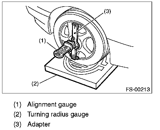 1) Place the front wheel on the turning radius gauge. Make sure the ground contact surfaces of the front and rear wheels are at the same height.