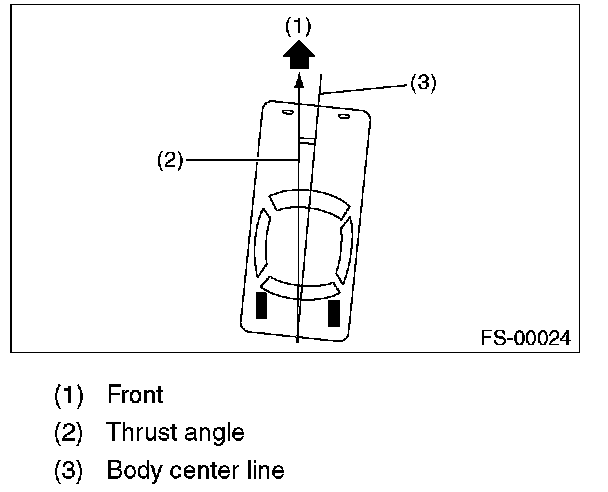 Thrust angle is a mean value of left and right wheel toe angles in relation to the vehicle body center line. Vehicle is driven straight in the thrust angle direction while slanting in the oblique direction depending on the degree of the mean thrust angle.