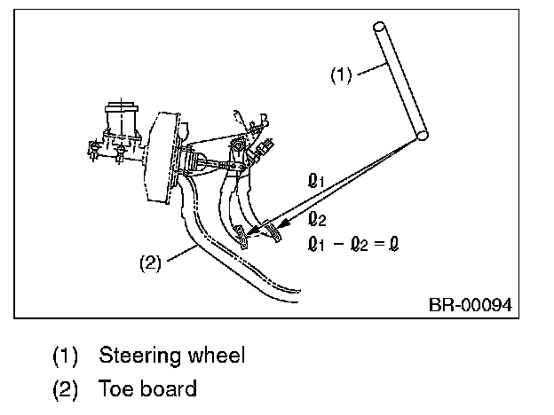 Run the engine at idle after warming up the engine, and depress the brake pedal with a force of 500 N (51 kgf, 112 lb). Measure the distance between the brake pedal and steering wheel. Release the pedal, and measure the distance between pedal and steering wheel again.
