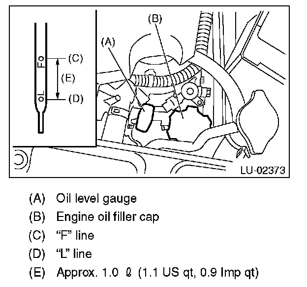 9) After the engine stops, recheck the oil level. If necessary, add engine oil up to the "F" line on level gauge.