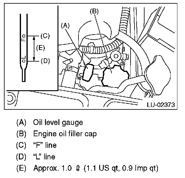 4) Pull out the oil level gauge again, and check the oil level. If the engine oil level is below "L" line, make sure that there is no oil leakage from the engine, then add oil to raise the level up to the "F" line.