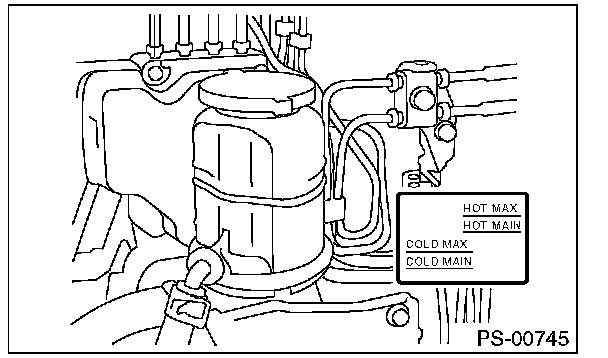 (1) Check at power steering fluid temperature 20°C (68°F); read the fluid level on the "COLD" side.