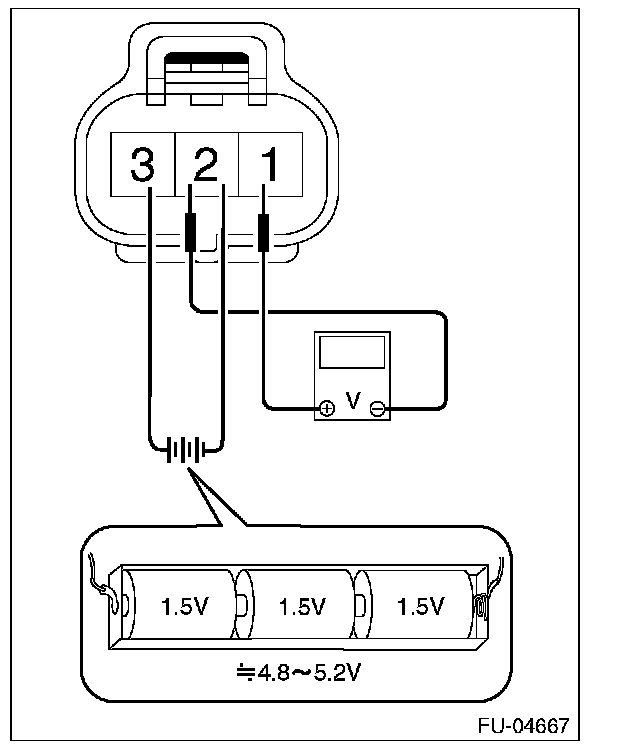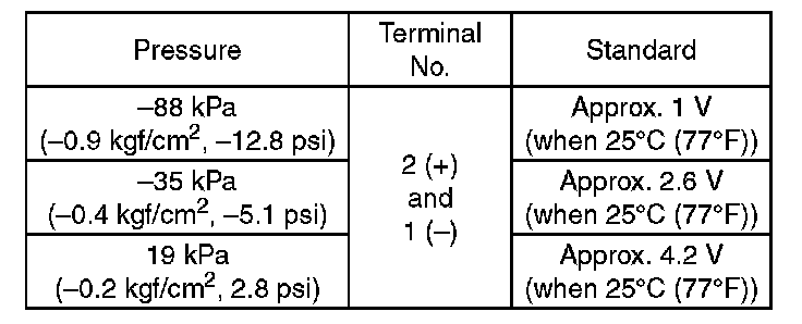 NOTE: When vacuum occurs at the pressure port of manifold absolute pressure sensor, the voltage will drop from the value as in step 3). When positive pressure occurs, on the other hand, the voltage will rise.