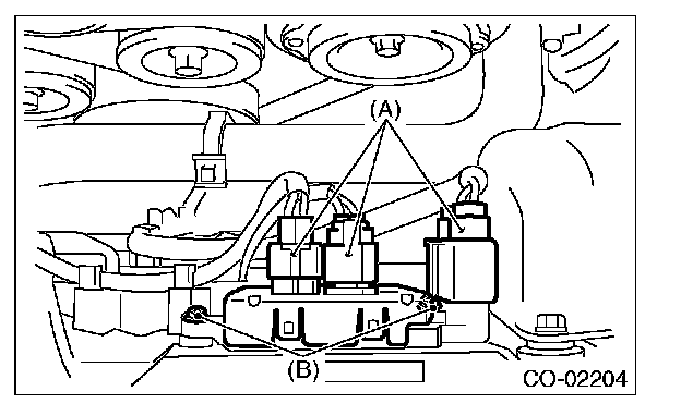 (2) Remove the screws (B) holding the radiator fan control unit.