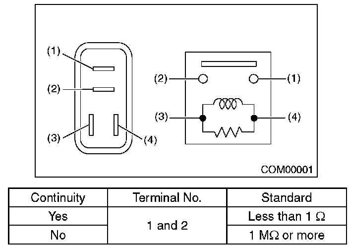 1. Connect terminal No. 4 to the battery positive terminal and the terminal No. 3 to the battery negative terminal, and check the resistance value between the horn relay terminals.