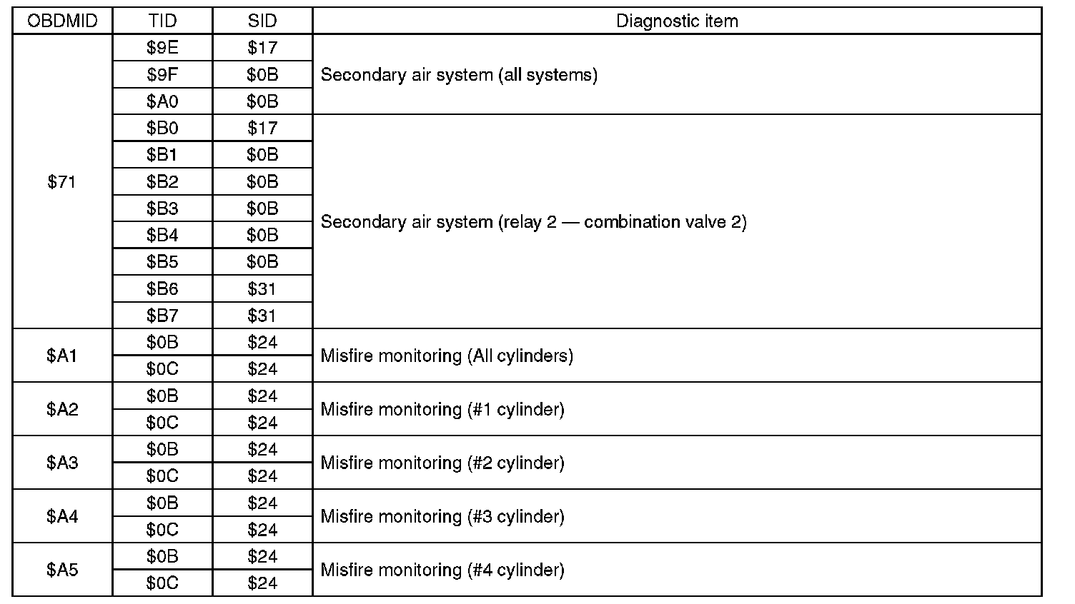 A list of the support data and PID (Parameter Identification) codes are shown in the following table.