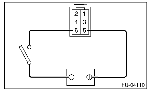 2. Connect battery positive terminal to terminal No. 5 and battery ground terminal to terminal No. 6, and inspect the fuel pump operation.