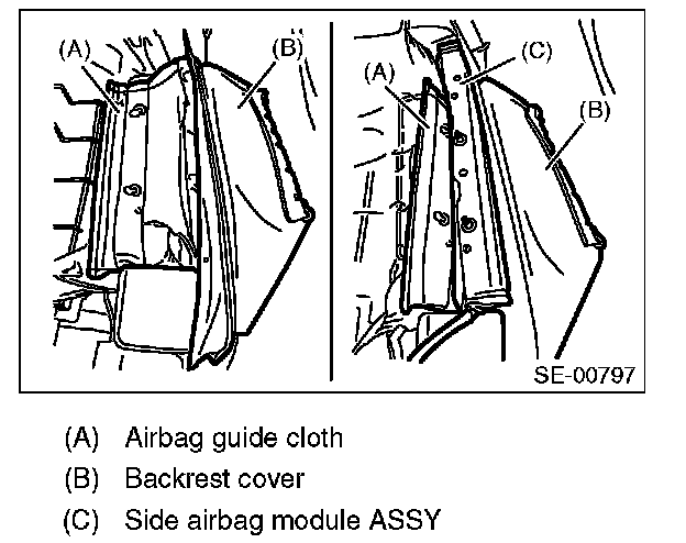 - When installing the side airbag module assembly, be sure to put the side airbag module between backrest cover and airbag guide cloth.