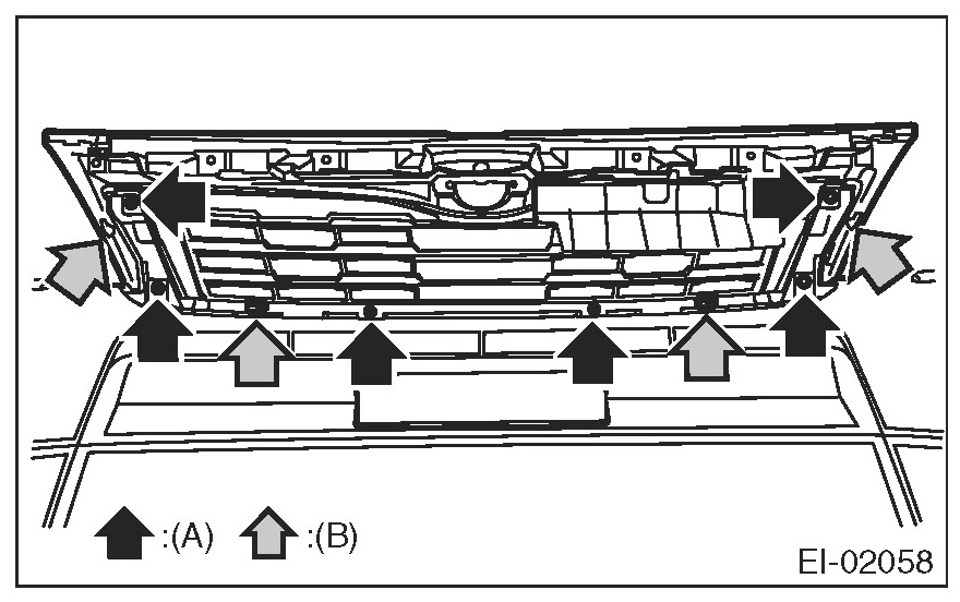 3. Detach the tabs (B) and remove the front grille assembly.