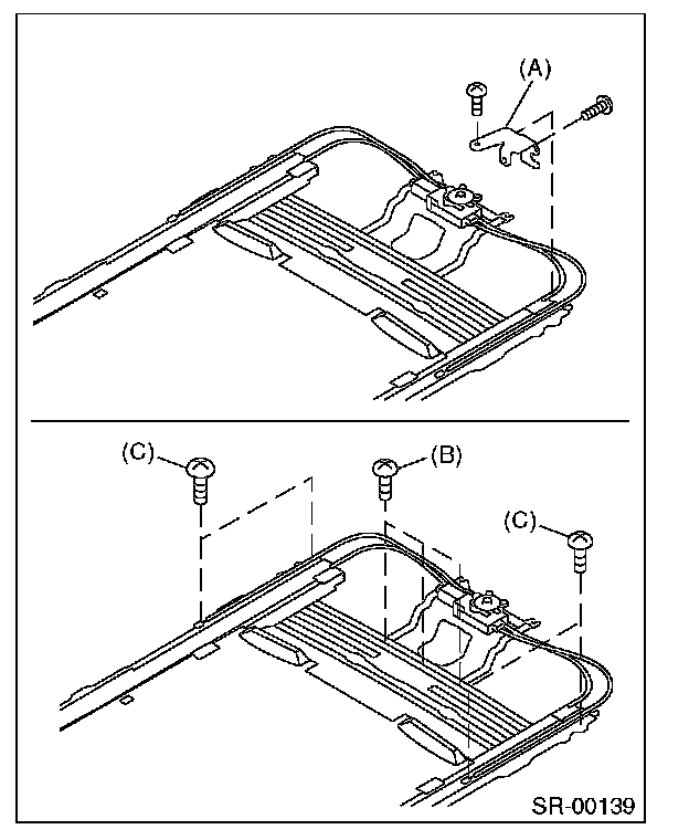 4. Remove the guide pipe screw (C), slightly pull out the guide pipe from the guide rail and then lower the motor bracket.