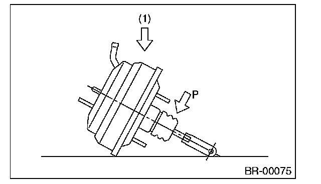 ^ If external force (1) is applied from above when brake booster is placed in this position, the resin portion as indicated by "P" may become damaged.